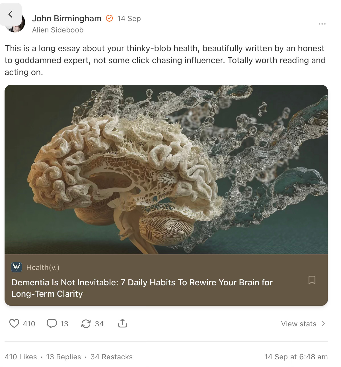 Anyway, I was going to restack the post, when I remembered the beef I got into with some chode on Notes, who’d dropped into my TL to tell me another post I’d enjoyed and shared (this one on brain health) was just AI slop.